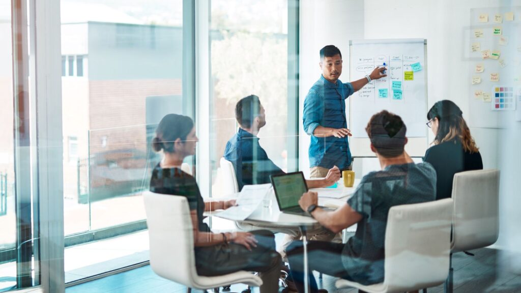 Team collaborating on mobile website wireframes and scalable infrastructure design. Visual elements show responsive UI layout planning and user experience optimization for small business websites.